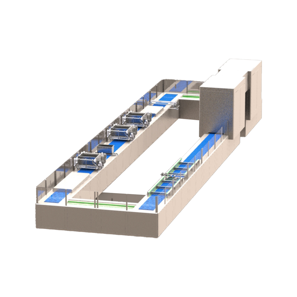 Hat; kalıp besleme ünitesi, depozitör sistemi, titreşim modülü, soğutma tüneli, kalıp çevirme ve ürün boşaltma istasyonlarından oluşur. Otomasyon kontrollü sistem, tüm üretim parametrelerinin hassas şekilde ayarlanmasını sağlar.
